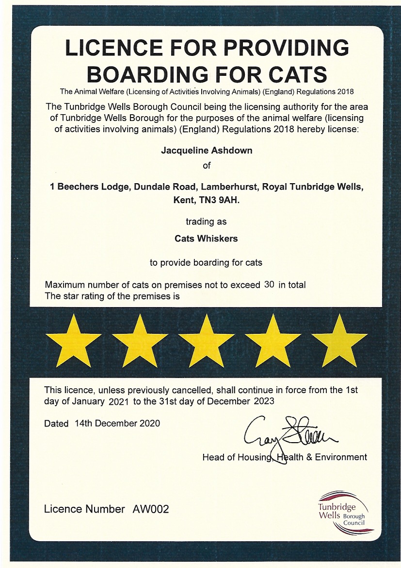We have recently been awarded a 5 Star rating from Tunbridge Wells Borough Council which means we meet all the criteria required to meet the higher standards for catteries. So, you can rest assured your cat will receive the best of care and attention from the team with over 60 years’ experience between them caring for your cats plus 5 cats of their own..